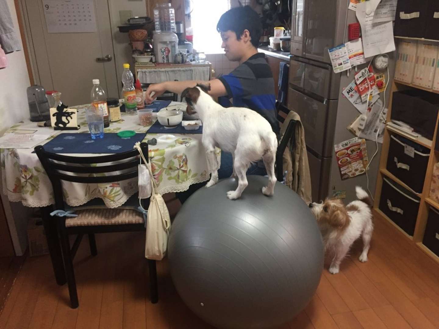 「食事をしていると犬がバランスボールに乗って覗きに来る」