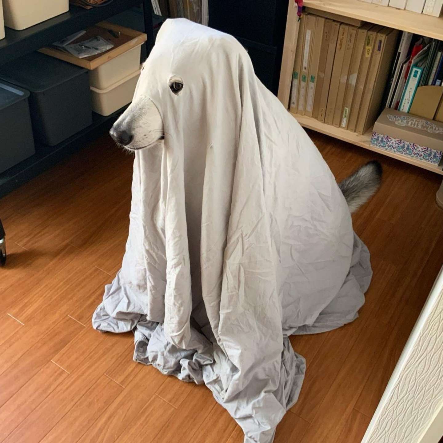 こちらはツイッターユーザーのriya(@_riya)さんが投稿した写真。映っているのは、目と鼻のところに穴を開けた布をすっぽりと被ったわんこ。お化けの仮装という訳だ。