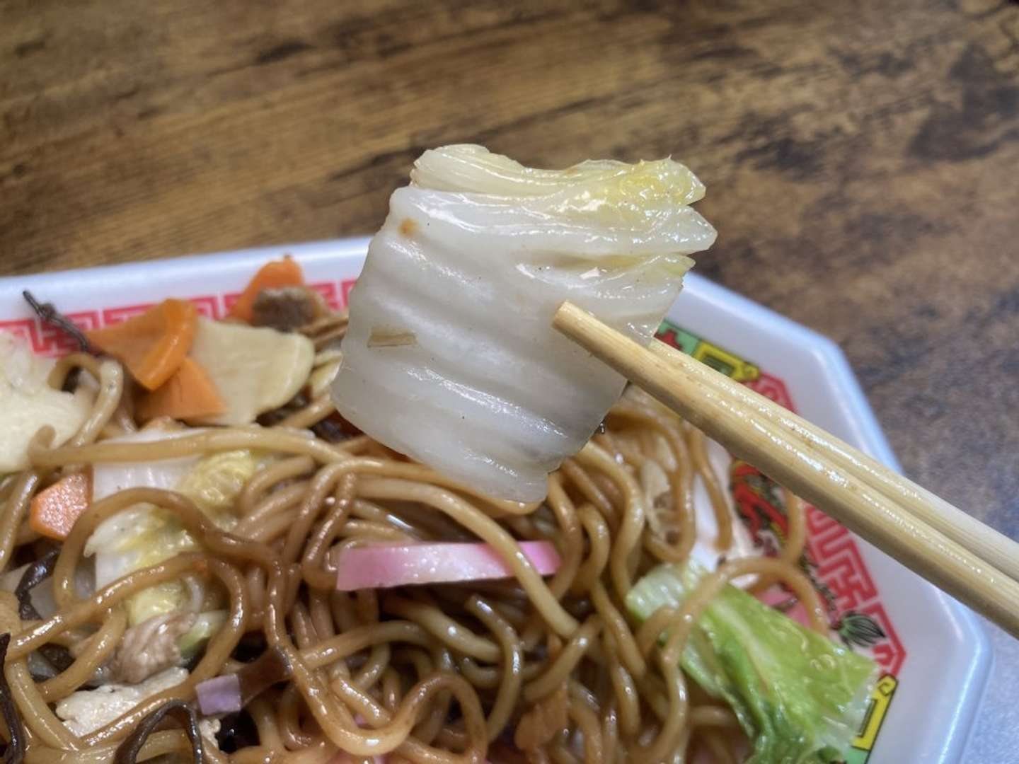 しっかりしたサイズの白菜。単体で食べるには薄めの味付けですが、あんかけ焼きそば感の演出としてはイイ仕事をしています。