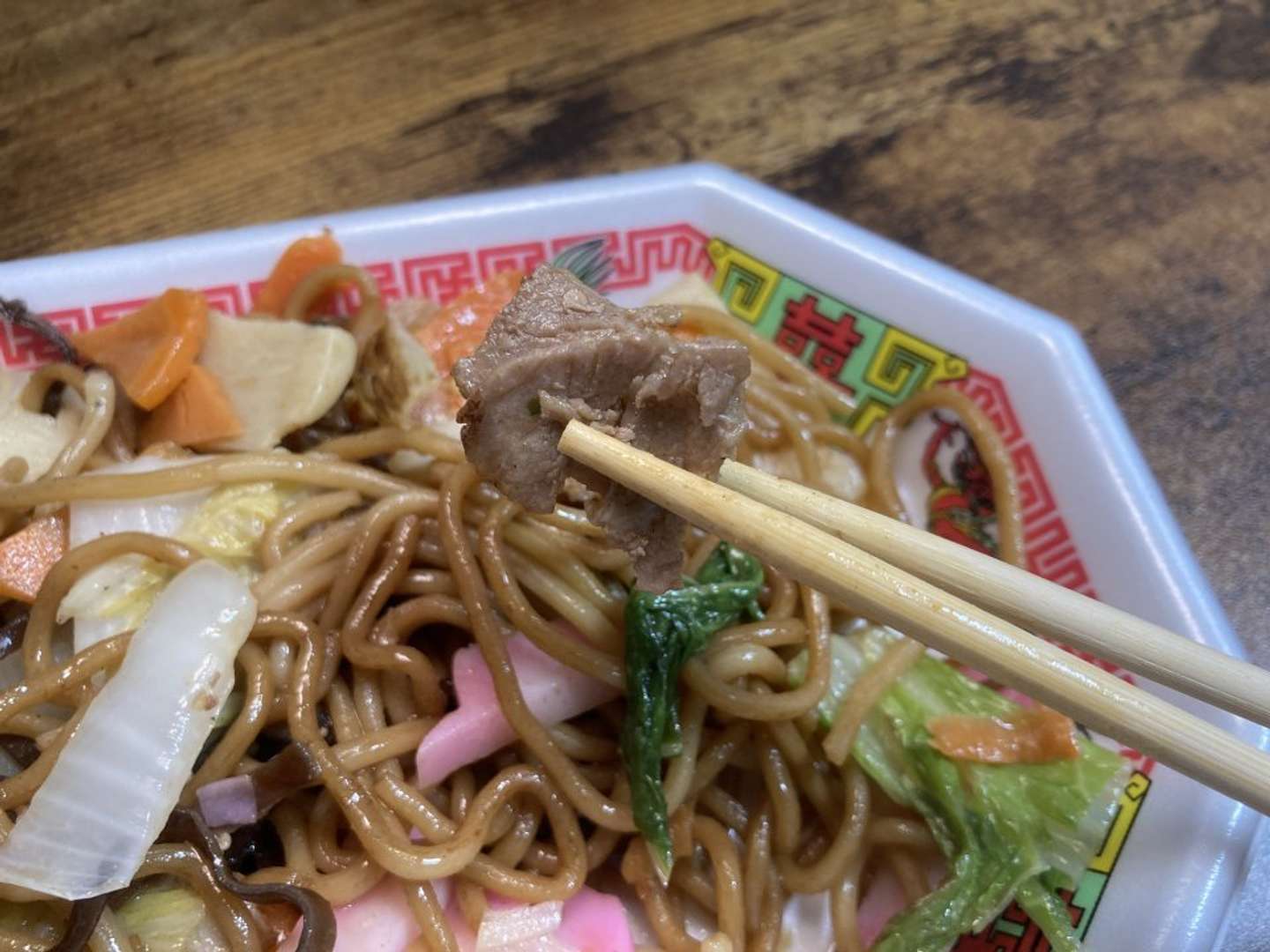 「麺が自慢の上海風焼きそば」では、カップ麺のかやくを彷彿させるサイズのキャベツ、それよりはるかに小さな豚肉(2かけらのみ発見)、ニンジン、タマネギなどが少しずつ入っていました。