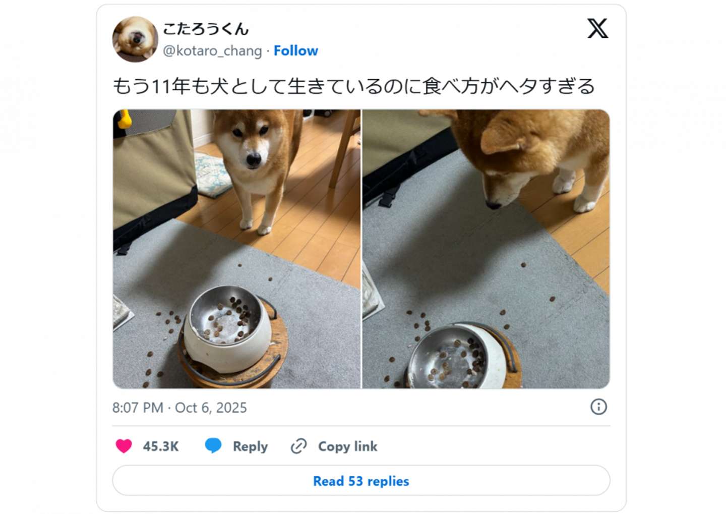 「もう11年も犬として生きているのに食べ方がヘタすぎる」 そんなポストがX上に投稿され、話題になっている。 おっと(画像提供:@kotaro_changさん) Xユーザーの@kotaro_changさんが2025年10月6日に投稿したのは、ドッグフードが散らばった床の写真。激しく食べたことが伺える光景だ。 しかし、散らかしたであろうワンちゃん自身は「あれ?なんか床に落ちてる」とでも言いたげな表情でこちらを見つめている。 この白々しいワンちゃんは、柴犬のこうたろうくん(11歳、オス)。 たしかに11歳にしては、子供のような食べっぷり。しかしこうたろうくん、いつでもこんなに散らかしてしまうわけではないようで......。 いつでも下手なわけじゃない! 画像提供:@kotaro_changさん こうたろうくんは、上手にフードをたべることもできる。 証拠に、7日に投稿された写真では、フードは一粒残らず食べられている。 お上手!(画像提供:@kotaro_changさん) 飼い主さんによると、こうたろうくんはドッグフードにおいしいものがトッピングされていると、慌てて食べてしまう。すると、こんな惨状になるのだとか。 話題の写真を撮影したときは、牛肉をトッピングしていたそう。 「周りが汚くなりすぎていて思わず笑ってしまいました」 と飼い主さんも苦笑いのようだ。 牛肉、おいしすぎるわん...(画像提供:@kotaro_changさん) おいしいものに一直線のこうたろうくんの姿に、Xユーザーからは4万5000件を超えるいいねのほか、 「ワンコも不思議そうに見てる 自分が溢した所を笑」 「可愛すぎます!なんでこぼれてるの?って他人事のように眺めてるの...ほんとにかわいい🐕」 「かなーりこぼしてますな。そんなキミが大好きさ!」 といった声が寄せられている。皆さん。メロメロのようだ。 こうたろうくんが11年間で学んだこと。それは「こぼしても何とかなる」だったのかもしれない。(ライター:Met)