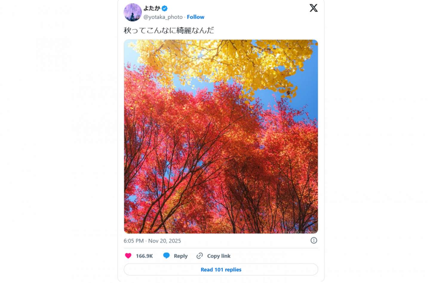 「秋ってこんなに綺麗なんだ」 紅葉と銀杏、見上げた空の〝三色〟に16万人大感動