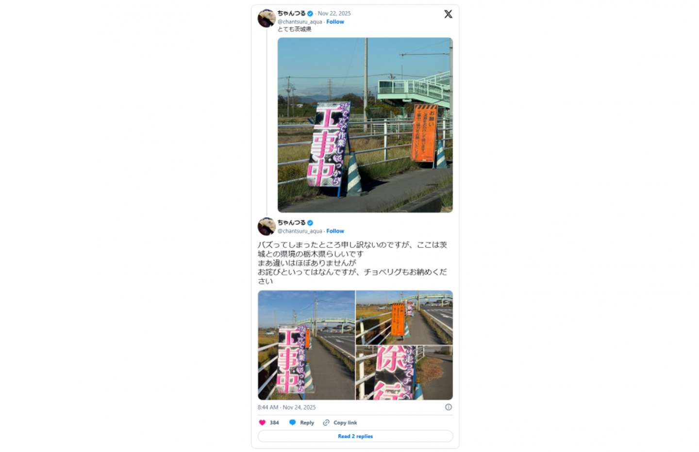 栃木県で発見された〝ギャルすぎる工事看板〟がX上で15万件を超えるいいねを集めるなど、大注目を浴びた。 ギャルすぎ(画像はちゃんつる@chantsuru_aquaさんの投稿より) ショッキングピンクにパープル。そしてシルバーのような輝き。工事のお知らせにしてはあまりにも〝ギャル〟な雰囲気だが......何故こんなデザインに? 2025年12月17日、看板を手掛けた青木組・代表取締役の青木慎吾さんに詳しい話を聞いた。 「徐行」バージョンも(画像はちゃんつる@chantsuru_aquaさんの投稿より) 話題の看板は栃木県小山市にある「生井歩道橋」付近に立っている。11月19日に設置したものだという。 栃木県発注の舗装修繕工事をするにあたり第三者に工事中の注意を促すため、メーカーから購入した立て看板だという。 「ギャル語録」用いて目指すのは? デザインの意図は何か。青木さんはこう語る。 「公共工事現場の固いイメージと現場の雰囲気を和ませるために、遊び心のあるギャル語録を用いた看板を採用しました」(青木慎吾さん) 別の現場でも設置している(画像提供:青木組) そのデザインがSNS上で注目を集めていることについて、青木さんは 「ギャル看板でこんなに注目されるとは思っていなかったので、正直びっくりしています。SNSや実際の現場を見てもらい建設業や弊社への興味を持ってもらえたら社員一同の励みにもなると思います」(青木慎吾さん) とコメントしている。 工事現場の雰囲気を和やかに(画像提供:青木組) 青木組では生井歩道橋付近以外の場所にも同様の看板を設置しているそうなので、ご近所の人は探してみては?