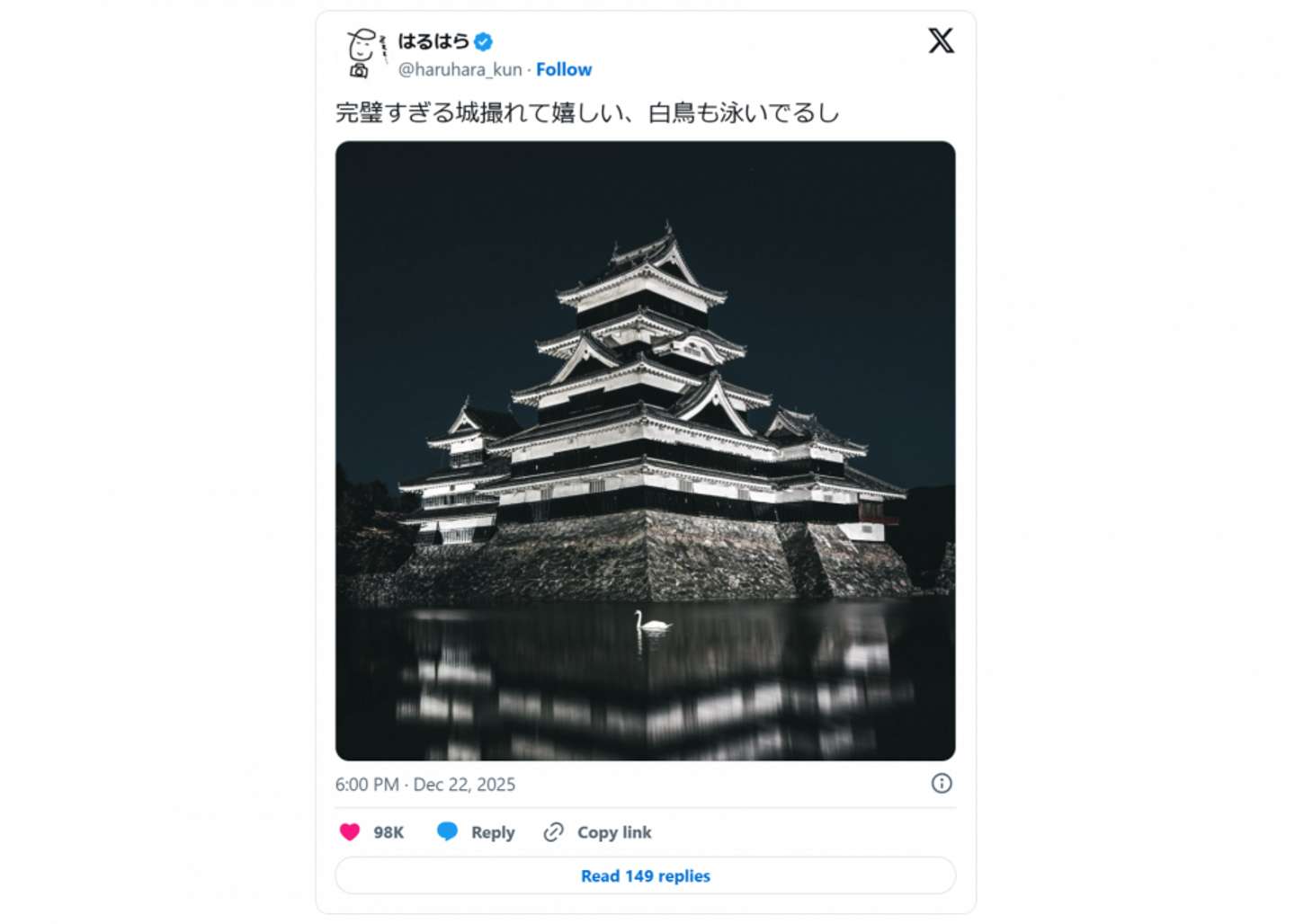 長野県で「完璧すぎる城」が激写された。 そのあまりの神々しさが、X上で話題になっている。 はるはら(@haruhara_kun)さんの投稿より、とある深夜の松本城 Xユーザーのはるはら(@haruhara_kun)さんが2025年12月22日に投稿したのは、漆黒の夜空を背景にライトアップされたお城。真下に広がる水面にも、その姿が浮かんでいる。 そしてその中央には、まるで神が舞い降りたかのように一羽の白鳥が佇んでいた。 取材に応じたはるはらさんによると、この1枚は2022年11月のある日の深夜に、長野県の松本城で撮影されたもの。 もともと紅葉との共演を狙って訪れていたのだが、夜中に再訪したところ美しいリフレクションが広がっていることに気づき、急遽撮影を決意したそう。 粘って粘って、奇跡の1枚に はるはら(@haruhara_kun)さんの投稿より、再掲 「できれば白鳥も一緒に撮りたい」 そう思い立ってからが本番だった。白鳥は夜でも動き回り、なかなか理想の位置に来てくれない。コンビニで買った肉まんを頬張りながら約2時間粘り続け、ついにベストポジションに白鳥が泳いできた瞬間をカメラに収めた。 「この場所を通った時はこれだ!と一人ですごく喜んでいました」 と当時を振り返る。 まさに"粘り勝ち"と呼ぶべき美しい光景に、Xユーザーからは9万8000件を超えるいいねのほか、 「おお...!!凄いタイミングですね」 「あまりにも完璧🔥」 「神か!?」 いった声が寄せられている。 人々を魅了する、気まぐれな白鳥。まさに神の風格だ。(ライター:Met)