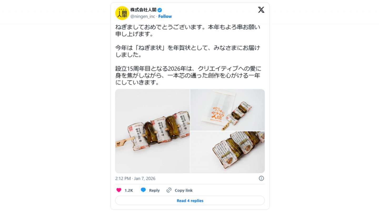 初笑いはコレに間違いナシーーそんな〝型破り〟な年賀状が、X上で注目を集めている。その実物が、こちら。 おいしそう(画像提供:人間) ズバリ、「焼き鳥串風」の年賀状である......って、いやいや、どういうこと!? 周囲が焼け焦げて丸まったハガキと、香ばしそうな焼きネギが、「ねぎま」のように串に交互に刺さっている。その串には「ねんが」の文字。 「こんな年賀状があるか」とツッコミたくなるが、実際にコレを受け取ったという報告が、SNS上にあがっているのだ。 いったい誰が、なぜ、こんな珍妙な年賀状を作ったのか? Jタウンネット記者は2025年1月8日、送り主に話を聞いた。 「面白くて 変なことを 考えている」 なぜ焼き鳥?(画像提供:人間) ねぎま串風年賀状を作ったのは、Webコンテンツの企画やイベント制作事業などを手掛ける大阪市の企業「人間」だ。 取材に応じた代表の山根シボルさんによると、「人間」では2011年から毎年、ユニークな年賀状を作って送付している。 たとえば、2012年は「スパム年賀」。お肉の缶詰のスパムを模した年賀状を送ったそう。裏面には迷惑メールの「スパム」を模したメッセージが書かれている。 2012年の「スパム年賀」(画像は人間公式サイトより) 昨2025年は、サザエの殻にハガキがくしゃっと詰め込まれたデザインの「年貝状」。〝加〟を取っちゃったらしい。ハガキは布製で長く、サザエの身を取り出すようにドゥルンと引き出せる。 なぜ、そんなことをしているのか。山根さんが説明する。 「『面白くて 変なことを 考えている』という弊社の精神に基づき、例年、変な年賀状を制作・送付しております。創業当時は『まずは注目を集め、仕事の機会を得たい』という意図もありました」 今では名物企画に それから15年が経ち、〝オモシロ年賀状〟を楽しみにしてくれる人も増えていった。今ではすっかり名物企画になっているそうだ。 2025年はサザエを模した「年貝状」(画像は人間公式サイトより) 16作品目となる26年の年賀状は、焼き鳥のねぎまを模した「ねぎま状」。今年は初の試みとして社外からもアイデアを募集し、最終的に集まった179案の中から、特に見た目のインパクトが強かったこれを採用した。 反対側にはメッセージも......って、「ねぎましておめでとうございます」!?(人間公式Xアカウント(@ningen_inc)の投稿より) 焼き鳥をモチーフに選んだ理由について、山根さんは「後付けにはなりますが」と前置きしつつ、こうも語った。 「設立15周年を迎える2026年は、クリエイティブへの愛に身を焦がしながら、一本芯の通った創作を心がける一年にしたいという思いから、ねぎまの年賀状『ねぎま状』となりました」 なお、ねぎま状は「やきとり人間」と書かれた封筒に入って届けられたそう。その封筒もまた、まちの焼き鳥屋さんっぽい......。 封筒も付いている(画像提供:人間) インターン生やボランティアと一緒に、ねぎの素材からタレのつやまで、一から研究して手作りしたというこだわりの「ねぎま状」。X上ではこんな声が寄せられている。 「精巧に出来すぎている」 「クリエイティブへの狂気の愛だ」 「なんだかお腹が空く年賀状ですね」 また、ねぎま状を受け取った明和電機の社長・土佐信道氏が自身のXアカウントで紹介したところ、3万9000件を超えるいいねを集めるなど話題に。「おいしそう」という声も多く寄せられ、ねぎま状を制作したメンバーみんなで喜んでいるそうだ。