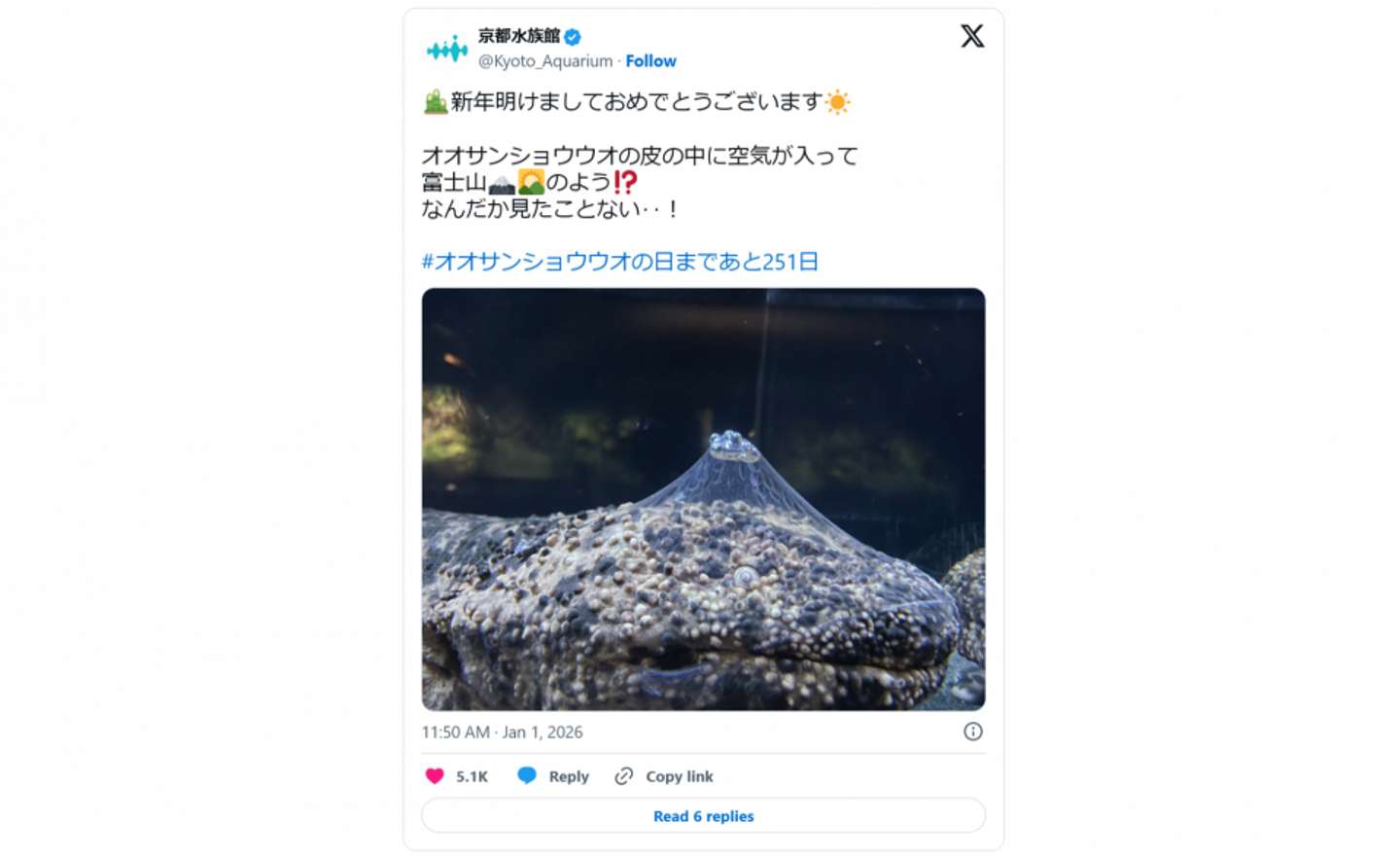たいへんに縁起が良さそうなオオサンショウウオが、X上で注目されている。 この形は...!(画像は京都水族館公式Xアカウントより) 2026年1月1日、京都水族館の公式Xアカウント(@Kyoto_Aquarium)が新年の挨拶を添えて紹介した、その1匹。 頭に注目すると......なんだか透明な"盛り上がり"がある。その先端部には小さな泡が集まっていて......。 「オオサンショウウオの皮の中に空気が入って 富士山のよう!? なんだか見たことない‥!」(京都水族館の投稿より) そ、そうだ! この形、たしかに富士山だ~! Jタウンネット記者は7日、オオサンショウウオの頭上に出現した「富士山」について、京都水族館に話を聞いた。 運が良ければ見られるかも フジサンショウウオ、再掲(画像は京都水族館公式Xアカウントより) 取材に応じた展示飼育チームスタッフの芹ケ野友哉さんによると、注目を集めたのは、京都水族館で2012年から飼育しているオスのオオサンショウウオ。 館内で1頭だけ展示されている「在来種」の個体で、推定年齢は20歳以上だという。 「在来種は『国の特別天然記念物』で、現在チュウゴクオオサンショウウオや交雑個体が増え、絶滅の危機に瀕しております。こういった問題も少しでも知っていただければと思い、展示しております」(芹ケ野さん) 頭に"富士山"を乗せていたのは2023年3月24日。開館準備の際に健康状態をチェックしようとした際に発見し、撮影したという。 館内で1頭だけの「在来種」(画像提供:京都水族館) この富士山を生んだ薄い膜のようなものは、「脱皮皮」。 オオサンショウウオは肺呼吸と合わせて皮膚呼吸も行う。その際に新鮮な空気を取り込みやすいよう、体表をキレイに保つために脱皮をするんだとか。 「古い皮は石の表面に擦りつけたり自身で飲み込んだりして剥がしますが、今回は少し浮き上がった古い皮の下に吐き出した空気が入り込んで溜まり、見事な富士山になったようです。 足の形そのままに脱いだ皮は時々見るのですが、山型になっているものは初めて見たので、見事な山っぷりに思わず笑ってしまいました」(芹ケ野さん) 「在来種」を展示している「京の川」エリア(画像提供:京都水族館) 偶然によって誕生した〝フジサンショウウオ〟の姿に、X上ではこんな声が寄せられている。 「どういう現象?!?!」 「何で...?🤔(※あまりに衝撃すぎて困惑)」 「何がどうなってるのか全然わかんない!😂」 「縁起いい」 「こりゃ新年早々めでたい」 「小さな王冠とベールにも見えて可愛いです」 こうした反響について、芹ケ野さんは 「このどっしりした富士山を見た皆さんの一年が良い年になれば嬉しいです。在来種は現在も展示中の個体なので、運が良ければちょっと変わった脱皮姿を見ることができるかもしれません。是非オオサンショウウオたちに会いに京都水族館に足を運んでもらえればと思います」 とコメントしている。