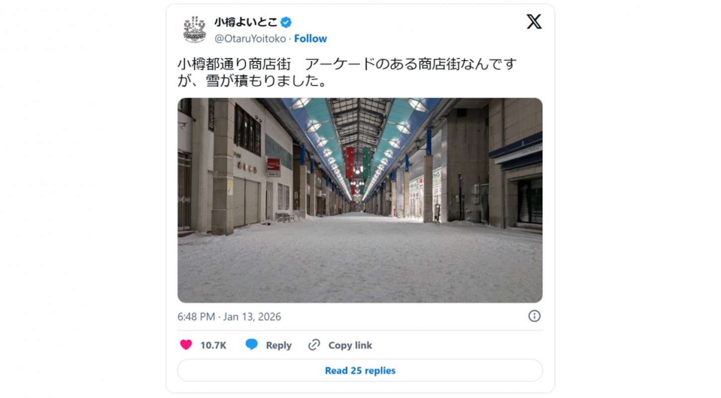 「小樽都通り商店街 アーケードのある商店街なんですが、雪が積もりました」 そんな報告が、Xユーザーたちを驚かせている。 地面を覆う雪(画像は小樽観光協会公式Xアカウントより) 2026年1月13日、小樽観光協会公式Xアカウント「小樽よいとこ」(@OtaruYoitoko)が投稿したのは、通りの地面が雪に覆われた商店街の光景だ。 しかし、その上に空は見えない。 屋根のあるアーケード商店街に、一体どうしてこんなに雪が降り積もることに......? Jタウンネット記者は15日、真相を小樽観光協会に聞いた。 建物がガタガタいうほどの強風 画像は小樽観光協会公式Xアカウントより、再掲 取材に応じた小樽観光協会公式Xの担当者によると、投稿写真は13日、職場から帰宅する途中で町の様子を確認していた際に撮影したものだ。 日本気象協会公式サイト「tenki.jp」によると、13日の北海道では低気圧の通過に伴い、広い範囲で雪が強まると予想されていた。 「この日は午後から雪と風がひどく、事務所で働いているときにも風で建物がガタガタとなっておりました。外を歩くのは危険な状況だったと思います」(公式X担当者) 13日朝の町の様子(画像提供:小樽観光協会) 13日にアメダスが小樽で観測した積雪深は60~70センチ、最大風速は10メートル毎秒。風速10メートル毎秒の風と雪は、気象庁の定義する吹雪に当てはまる。 「雪と強風の為、通路や建物の間からアーケードに雪が入り込んで積もったと思われます。ごくまれにこのような現象が起こります」(公式X担当者) と担当者は語る。 この日は、現場を確認する前から「さらっと白くなっているかな」とは思っていたそうだが、実際の状態は想像以上のものだったそう。 「これは、日中かなりひどかったんだなあと感じました。そして個人的には、『あ、帰ったら家の周りの雪かきだな』と思いました」(公式X担当者) 13日夜の運河の様子(画像提供:小樽観光協会) 雪国ならではの不可思議な現象。アーケード下の雪道に、X上では1万件以上のいいね(15日夕時点)のほか、こんな声が寄せられている。 「雪撒いた?」 「どうして? 摩訶不思議」 「おそるべし、北海道」