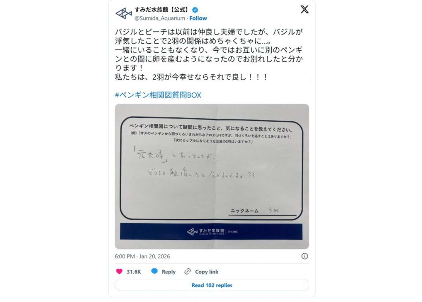 ペンギンたちの〝恋愛事情〟に関するQ&Aが、X上で注目を集めている。 東京都墨田区の「すみだ水族館」が投稿したものだ。その内容は......。 たしかに...(画像はすみだ水族館公式Xアカウントより) 「『元夫婦』とありましたが、どうして離婚したと分かるのですが?」 この質問は、すみだ水族館が2025年12月13日に館内に掲示した、「すみだペンギン相関図2026」を見た来館者から寄せられたもの。 同館には58羽のマゼランペンギンたちが暮らしており、相関図では彼らの関係性が示されている。 すみだペンギン相関図2026(画像はすみだ水族館公式サイトより) 「元夫婦」と書かれているのは、オスの「バジル」とメスの「ピーチ」の間や、オスの「パイン」とメスの「イチゴ」の間。 たしかに、結婚式をあげたり離婚届を出したりするわけじゃないのに、飼育スタッフさんたちにはどうして2羽が破局したことがわかるのだろうか? ペンギンでも人間でも... なんでわかるの?(画像はすみだ水族館公式Xアカウントより) 質問に対して、すみだ水族館は次のように回答している。 「バジルとピーチは以前は仲良し夫婦でしたが、バジルが浮気したことで2羽の関係はめちゃくちゃに...。 一緒にいることもなくなり、今ではお互いに別のペンギンとの間に卵を産むようになったのでお別れしたと分かります! 私たちは、2羽が今幸せならそれで良し!!!」 なるほど! それぞれ別のパートナーと子供を作ったから判明したのか。 それにしても、浮気がきっかけで破局を迎えるとは......ドロドロの恋愛事情がペンギンたちにもあるという驚きの事実に、X上では3万1000件以上のいいね(26日夜時点)のほか、こんな声が寄せられている。 「深すぎる、ペンギンの恋愛模様...」 「ペンギン界にもそーゆーのあるんやなぁ...」 「慰謝料として鯵半年分とか支払われれた支払われたのだろうか」 この相関図の見所は? 水族館でペンギンたちを見る時のポイントは? Jタウンネット記者は、すみだ水族館の飼育スタッフにも話を聞いた。28日午後5時公開の続報でお伝えする。