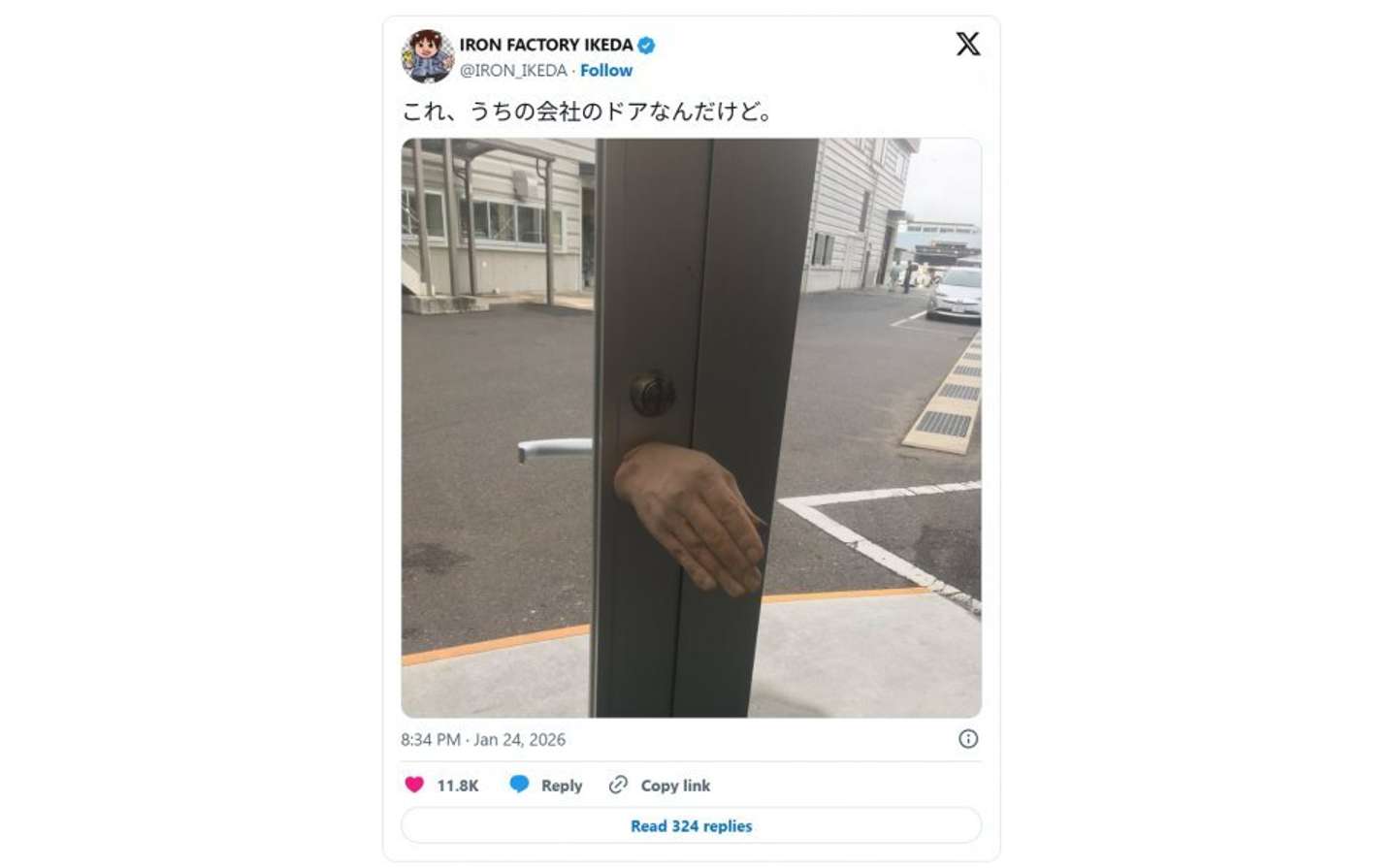 ――うちの会社、殺人鬼がいるかも。どんな会社? そんな大喜利の回答みたいなオフィスの風景が、X上で注目を集めている。 ひえっ(画像はIRON FACTORY IKEDA@IRON_IKEDAさんの投稿より) 「これ、うちの会社のドアなんだけど」 2026年1月24日、主に精密部品の製造などを行っているキャステム(本社:広島県福山市)で商品開発に携わる「IRON FACTORY IKEDA」(@IRON_IKEDA)こと池田真一さんがそんな呟きと共に紹介したのは......手、だ。 外へと繋がる扉のドアノブがあるはずの部分に、人間の手首がくっついている。 ビックリどころの話ではない絵面だが......一体、何でこんな所に手首が? ショッキングな光景に、X上では1万1000件以上のいいね(27日夕時点)のほか、こんな声が寄せられている。 「文字通りの取っ手か...」 「今にも動いてきそうなの怖い」 「夜中見たら腰抜かす自信あるわ...」 「夜中はじめて見たら悲鳴上げますよ」 Jタウンネット記者は26日、ドアの〝手〟について池田さんに話を聞いた。 納得! ......できるか? なぜここに?(画像はIRON FACTORY IKEDA@IRON_IKEDAさんの投稿より) 池田さんによると、注目を集めた〝手〟はもちろん、本物の人間のものではない。数年前に池田さんが同僚数名と制作し、部署に入るドアに設置していたものだという(事務所移動のため現在は非設置)。 ......いや、なんでそんなことしてたの? それは、キャステムが2016年から展開しているブランド「ヒストリーメーカー」と関係がある。スポーツ選手やアイドル、アーティストなどの手形をリアルに再現し商品化するという企画だ。 著名人の手をリアルに再現する「ヒストリーメーカー」(画像はIRON FACTORY IKEDA@IRON_IKEDAさんの投稿より) これまでマニー・パッキャオ選手、井上尚弥選手、田中将大投手、小野伸二選手ら超一流のスポーツ選手など200人以上の手型や足型を商品化。100万円を超える商品も〝瞬殺〟で完売するなどの人気っぷり。 マニー・パッキャオ選手の手型(画像はIRON FACTORY IKEDA@IRON_IKEDAさんの投稿より) 「手の血管やシワまで完全に再現している為、究極のファングッズと評価頂いております」(池田さん) 現在は、3年以内に大谷翔平選手の手型を採取することを目標にしているそうだ。 「そういったブランドを展開しているメーカーなら、『ドアノブは手であるべき!』という意見があり、手が設置されました」(池田さん) なるほど。「ドアノブは手であるべき!」という意見が......。ちょっとどういうことかよくわからないが、愉快な会社であることは確かだ。ちなみに、池田さんの手型から作ったそう。 設置されていた当時は、工場見学などのために来社する人たちに「とても面白がって頂けました」と池田さん。 「事務所にはこれまで製作した著名人の方の手型商品を展示しております。その手型を一通り見られて帰られる際のドアノブに手が登場するので、なんでドアノブが手なのか、納得頂けています」(池田さん) まあ、たしかに、その流れで見たら納得させられちゃうかもしれない。勢いで。