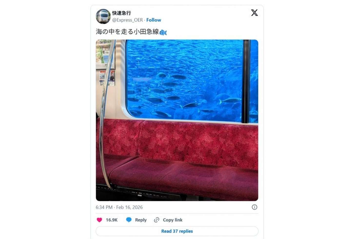 「海の中を走る小田急線」 そんな呟きと共に投稿された車窓風景が、X上で注目されている。 窓の外には...(画像は快速急行@Express_OERさんの投稿より) 2026年2月16日、Xユーザーの快速急行(@Express_OER)さんが投稿したのは、窓の外をたくさんの魚たちが泳いでいる電車内の写真だ。 な、なんて幻想的! こんな電車があるなら、毎日だって乗りたいかも。 とはいえ、海の中を走る電車なんて......? 一体、どういうこと? Jタウンネット記者は19日、投稿写真について快速急行さんに話を聞いた。 小田急海中線...てコト? 海の中が見える電車?(画像は快速急行@Express_OERさんの投稿より) 快速急行さんが〝海中電車〟に乗車したのは25年11月16日のこと。小田急線の藤沢駅、1番ホームに停車中に撮影したのが、話題の写真だ。 「偶然乗った電車の中からふと外を見たときに、窓ガラス越しに新江ノ島水族館の広告がちょうど見えて、まるで海の中にいるような感覚になりました。そこで、まだ電車も出発前で人も少なかったので、スマホを取り出して撮影してみました」(快速急行さん) そう。外にある海は駅に設置された大きな看板広告に印刷されたものなのだ! 「駅構内にこんな幻想的で非日常的な景色があったことに驚き、また『こんな見せ方があるんだな』と感動しました。普段見慣れた駅の風景がいつもと変わったように見え、新しくて斬新な発想の面白さとデザインの力を感じました」(快速急行さん) まるで夢の中のように神秘的で非日常的な光景に、X上では1万6000件以上のいいね(24日夕時点)のほか、こんな声が寄せられている。 「すげーなにこれ」 「とうとう、小田急、深海線まで、行ったのか」 「一瞬マジでビビったんだけど。本当にあったら嬉しいけど...」 「藤沢らしくて好き」 こうした反響について、快速急行さんは 「想像以上の反響でした! たくさんの方に見ていただけて嬉しかったです」 とコメントしている。 なお、新江ノ島水族館の駅の広告看板については、21年の記事『ドアの向こうは海の中? 小田急線の車窓からの絶景に反響「なにこれ凄い」「ファンタジーの世界だ」』で詳述している。合わせてお楽しみを!