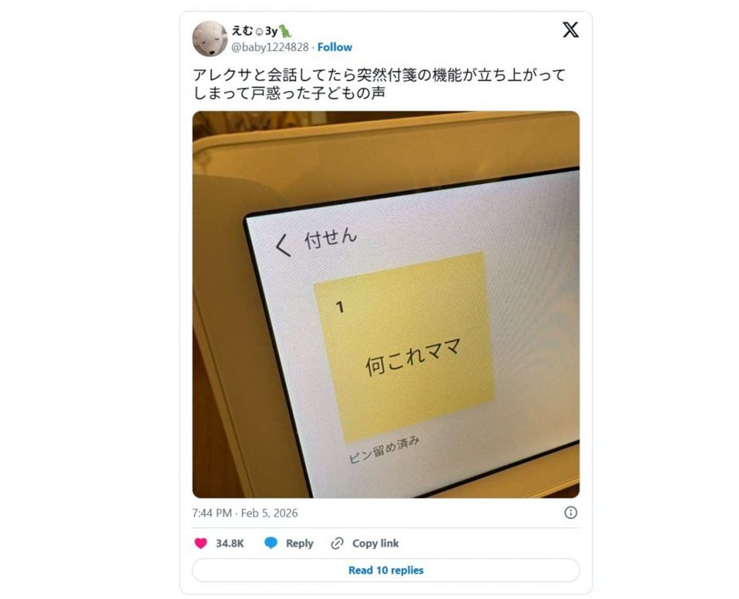 「アレクサと会話してたら突然付箋の機能が立ち上がってしまって戸惑った子どもの声」 そんな呟きと共に投稿された写真が、X上で注目されている。 付箋に書かれているのは...(画像はえむ@baby1224828さんの投稿より) 2026年2月5日、3歳児と夫と暮らすXユーザーのえむ(@baby1224828)さんが投稿したのは、液晶に表示された「付せん」の画面。 そこには短く、「何これママ」というメモだけが残されている。 突然現れた付箋にビックリして、真っ先にママを呼ぼうとした痕跡......ってこと? 微笑ましすぎて、一生残しておきたいな......。 Jタウンネット記者は19日、当時の状況についてえむさんに詳しい話を聞いた。 困ったときはアレクサよりも 付箋機能に残った言葉(画像はえむ@baby1224828さんの投稿より) えむさんによると、お子さんが付箋を立ち上げたのは2月上旬。えむさんの実家でのことだった。 「子どもがアレクサに天気を聞いたりするのにハマっていて、いつも通りアレクサと会話していたところ、何かを聞き間違えたのか付箋の画面が立ち上がった」(えむさん) そして、焦った子供が近くにいたえむさんにかけた言葉が、「何これママー!」だったという。 「子どものセリフが綺麗に切り取られていて微笑ましく、思わず笑ってしまいました」(えむさん) 忠実な音声認識によって生み出された〝ほっこりメモ〟に、X上では3万4000件以上のいいね(19日夕時点)のほか、こんな声が寄せられている。 「可愛すぎてじわじわくる」 「困った時はアレクサじゃなくてママなのが良いw」 「娘がこんなの残してたらカメラで撮って額縁飾っちゃう。かわいすぎる」 こうした反響について、えむさんは 「こんなに拡散されると思っていませんでしたが、ほっこり笑っていただけたみたいで良かったです」