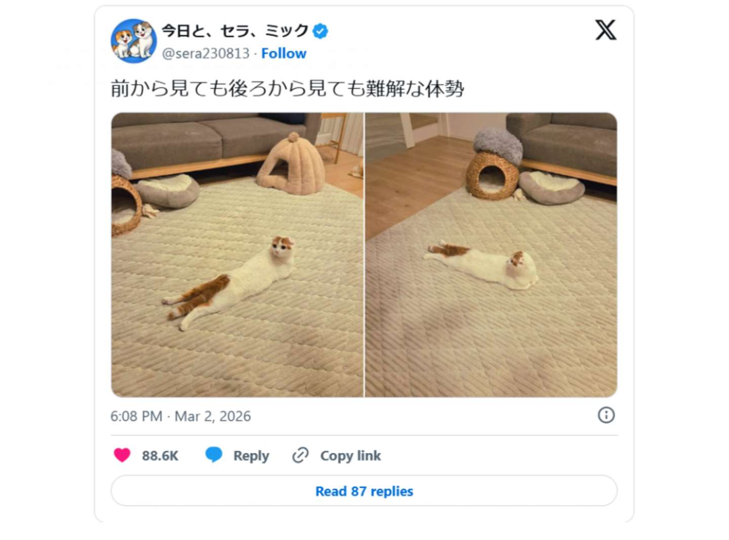 一体、どうなってるの!? 何度見ても、どの角度から見ても、理解が追い付かない......。 そんな不思議な猫の姿が、X上で注目を浴びている。 ......?(画像は@sera230813さんの投稿より) 「前から見ても後ろから見ても難解な体勢」 Xユーザーの@sera230813さんが2026年3月2日、そんな呟きと共に披露したのはカーペットの上で横たわる1匹の猫ちゃん。 全身を伸ばしきってリラックス......って、あれ? 体、どうなってる? 下半身はうつ伏せなのに、頭は仰向けのような......なんとも摩訶不思議な光景だ。 リラックスしていたら... (画像は@sera230813さんの投稿より、再掲) 取材に応じた飼い主さんによると、写真に映っているのは、スコティッシュフォールドのミックくん(8か月・男の子)。元気でやんちゃで甘えん坊、なおかつ食いしん坊な男の子である。 そんなミックくんが難解な体勢になったのは、夕食後のまったりタイム。ホットカーペットのど真ん中で伸びてリラックスポーズをとっていたところ、何か気になるものを発見した様子。 それを目で追いながら首だけをくるりと動かした結果......この奇妙なポーズが完成したとのこと。 別方向から(画像は@sera230813さんの投稿より) 実はミックくんにとっては"あるある"だというこのポーズに、Xユーザーからは8万8000件を超えるいいねのほか、 「ラッコみたい」 「芸術の域...かわよ...」 「不可思議体勢ニャンコ😳」 「どこがなにやら?」 といった声が寄せられている。 かまってほしい時はドリルのような頭突きで突進してきたり、食器を洗っていると興味津々でシンクに手を突っ込んできたりするという、ミックくん。 この不思議ポーズは、やんちゃで好奇心旺盛な性格を表す"ほんの一例"でしかないのかもしれない。(ライター:Met)