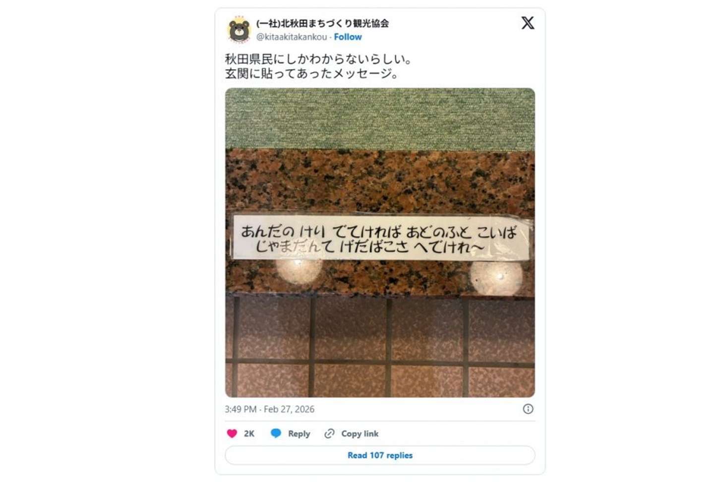 「秋田県民にしかわからないらしい。 玄関に貼ってあったメッセージ」 そんな呟きと共に投稿された文章が、Xユーザーたちを困惑させている。 なんて?(画像は北秋田まちづくり観光協会の公式Xより) 2026年2月27日、北秋田まちづくり観光協会の公式Xアカウント(@kitaakitakankou)が投稿したのは、どこかに貼られたこんな文言だ。 「あんだの けり でてければ あどのふと こいば じゃまだんて げだばごさ へでけれ~」 へでけれ~......と言われても、関東民の記者には何を伝えようとしているのかサッパリだ。 どうやら秋田弁らしいが、一体なんと書いてあるのだろうか。Jタウンネット記者は3月4日、北秋田まちづくり観光協会に話を聞いた。 こういう意味らしい どういう意味?(画像は北秋田まちづくり観光協会の公式Xより) 取材に応じた協会職員によると、このメッセージは北秋田市にある旅館「打当温泉マタギの湯」の玄関に掲載してあるもの。 標準語に訳すと、こんな内容になっているという。 「あなたの靴がでていると、後の人が来た時に邪魔になるので、下駄箱にいれてくださいね」 言われてみれば、「じゃま」とか「げだばご」からなんとなく意味は推測できたかもしれない。 とはいえ秋田県民以外にとってはまるで呪文のようなメッセージに、X上では 「意味わからん(笑)」 「ファミコン時代のパスワードかと思った」 「文字数とか違うだろうけど、ドラクエ1の復活の呪文かと思った」 といった声が寄せられている。 北秋田まちづくり観光協会の職員は反響について、「想像以上の反響で驚いています。秋田弁の良さやお宿さんの粋なはからいが一人でも多くの方に届いてくれると嬉しいです」とコメント。 ちなみにこのメッセージは現地でも困惑と、そして、温かな笑顔を生んでいるらしい。 記者が13日、「打当温泉マタギの湯」にも話を聞いたところ、メッセージは10年以上も前に貼られたもので、作った社員もすでに退職しているという。なぜ貼られたのか、その意図が分かるものはいない。ただ......。 「宿泊者の方の中には、この秋田弁の張り紙を一生懸命読んでいる姿が時々見受けられます。読みにくそうにしているときに、こちらが読んで差し上げますと、腑に落ちた表情になったり、笑顔になっております」(マタギの湯スタッフ) 旅行者の皆さんと、スタッフの皆さんの間の交流のタネになっている模様。なんだか、温泉に入る前に心があったまりそうだ。 〒018-4731秋田県北秋田市阿仁打当仙北渡道上ミ67 打当温泉「マタギの湯」 楽天トラベルで見る