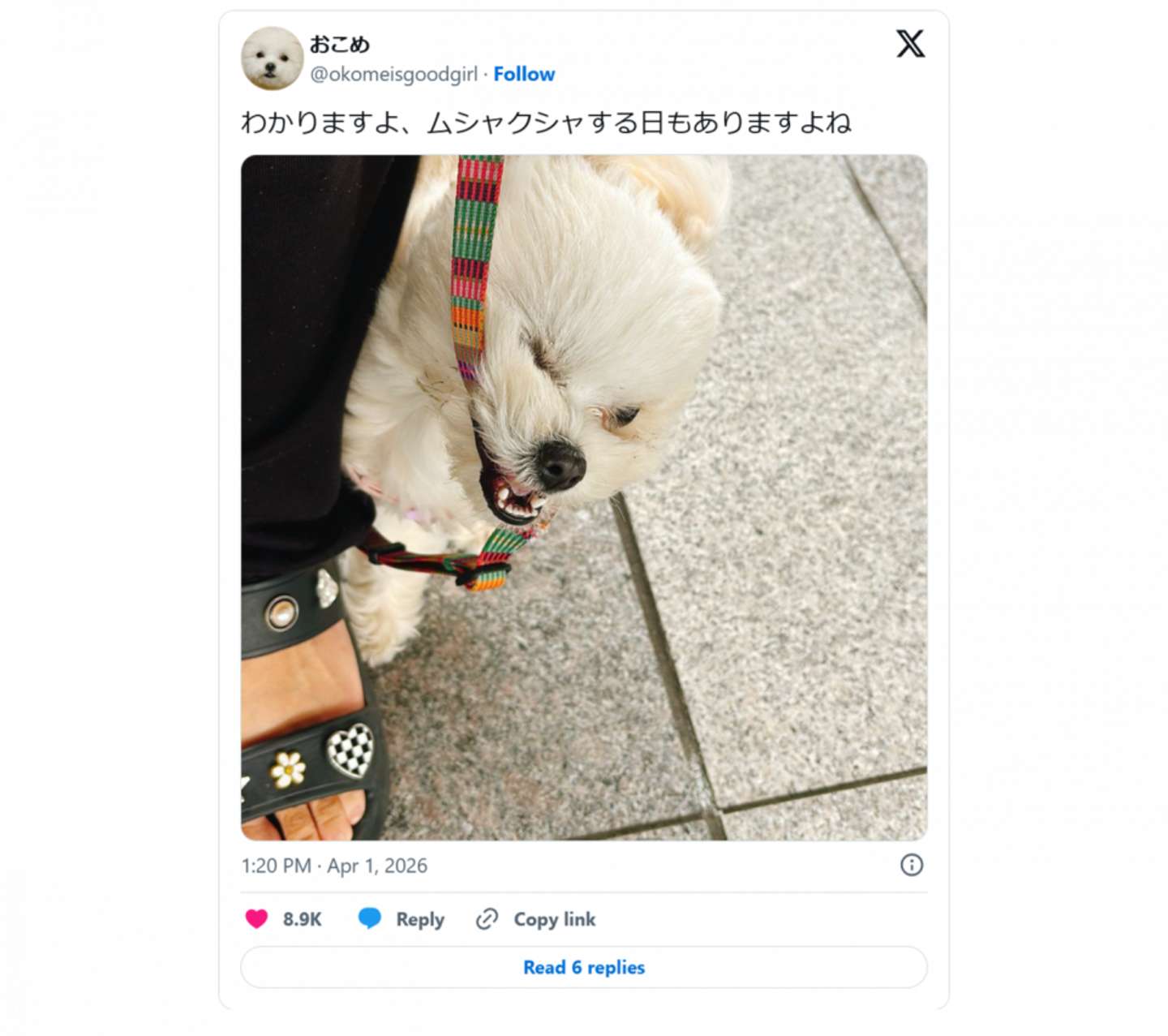 「わかりますよ、ムシャクシャする日もありますよね」 そんなポストがX上に投稿され、話題になっている。 画像提供:おこめ@okomeisgoodgirlさん Xユーザーの@okomeisgoodgirlさんが2026年4月1日に投稿したのは、お散歩中の白ふわワンコの写真。 自分と飼い主さんを繋ぐカラフルなリードを、激しく噛んでいる。歯をむき出しにしたそのお顔は、どう見ても「イライラMAX」という感じ。 この子に一体、何が......? 飼い主さんに詳しい話を聞いた。 怒りん坊モードに突入したワケ 画像提供:おこめ@okomeisgoodgirlさん 飼い主さんによると、むしゃくしゃしているのは、マルポメの「おこめ」ちゃん。 好奇心旺盛でお嬢様気質な1歳の女の子で、気が済むまでドッグランに居られなかったり、自分のタイミングでバイバイができなかったりすると、怒りん坊モードに突入するそう。 むしゃくしゃしていたのもまさに、帰りたくないタイミングで帰ることになった時のものだ。 ちなみに、当たりが強いのは飼い主さんに対してだけ。お友達やその飼い主さんには優しく振舞っているという。 「自由奔放なおこめが大好きなので、これからも人様のご迷惑にならない程度に自由に育てたいなと思います」(飼い主さん) 画像提供:おこめ@okomeisgoodgirlさん 画像提供:おこめ@okomeisgoodgirlさん ご機嫌な時には満面な笑顔でお散歩しているのに......。ギャップが凄すぎるおこめちゃんの怒り顔に、Xユーザーからは7000件を超えるいいねのほか、 「かわいい✨」 「お怒りが伝わります🙃」 「わんこもそんな日があるなら、がんばれる🥹」 といった声が寄せられている。(ライター:Met)
