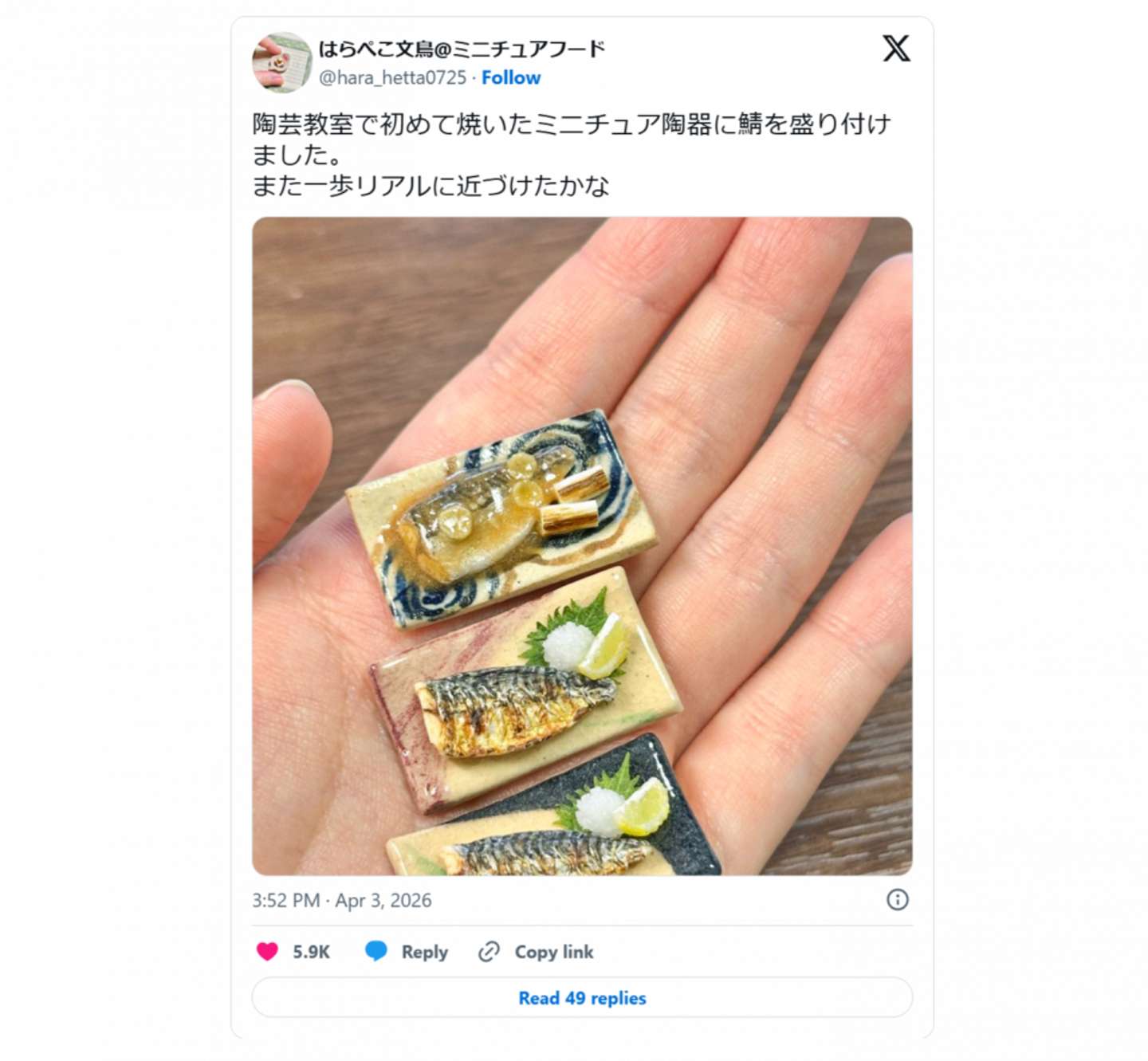 とってもおいしそうだけど、どうも背景がおかしいぞ......。 そんな光景がX上で注目を浴びている。 はらぺこ文鳥(@hara_hetta0725)さんの投稿より こんがりと香ばしそうな焼サバに、とろっとしたタレのサバの味噌煮。 どれも実家の食卓に並んでいそうな3皿だが......全て手のひらに乗っている。 そう。実はこのおいしそうなサバ料理たちは、すべてミニチュアなのだ。 ミニチュアフード作家・はらぺこ文鳥(@hara_hetta0725)さんが2026年4月3日に披露した1枚に、Xユーザーからは約6000件のいいねのほか、 「小人になったらかぶりついてしまいそうなほどリアルですね!美味しそうです✨✨」 「めちゃくちゃ手が大きい人と言われた方が納得出来そうなリアル感...」 「凄‼️美味そう~♪脳がバグるほどの再現力😋」 「凄すぎます...」 「食べられるでしょこれ。 匂いしそうです。」 といった声が寄せられている。 この作品を制作したはらぺこ文鳥さんに詳しい話を聞いた。 念願のお皿にあわせて 「陶芸教室で初めて焼いたミニチュア陶器に鯖を盛り付けました」 写真と共にそう呟いたはらぺこ文鳥さん。 様々な食べ物のミニチュアを制作している作家で、これまではその作品を載せる器として、オーブン粘土で作った食器を使用していた。 はらぺこ文鳥(@hara_hetta0725)さんの投稿より はらぺこ文鳥(@hara_hetta0725)さんの投稿より しかし、質感や強度へのこだわりから「いつかは本格的な陶芸用粘土でお皿を作ってみたい」と考えていたという。 そしてこの度、その思いを実現。実際に陶芸教室へ足を運んだ。 陶芸用粘土で皿を作り、釉薬をかけて窯で焼成してみると、実家の食器棚にあるような、陶芸でしか出せない味わいのある角皿が仕上がったとのこと。 鯖の切り身や味噌煮は、そのお皿に合わせて樹脂粘土で制作。完成までの期間は約2週間だったそう。 その仕上がりに、はらぺこ文鳥さん自身も大満足の様子だ。 「食器を本物の陶器で制作することで、これまで以上にミニチュアフード制作の幅が広がりそうでワクワクしています」(はらぺこ文鳥さん) ミニチュアなのに、どれもしっかりと食欲をそそってくる。なんとも罪な"ひとつまみ"だ。(ライター:Met)