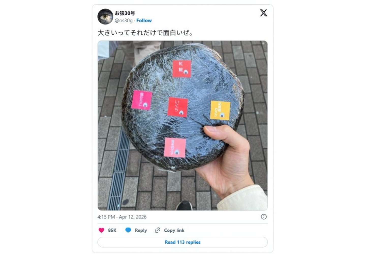 「大きいってそれだけで面白いぜ」 そんな呟きと共に投稿された〝ジャンボ〟なブツが、X上で注目を集めている。 なにこれ?(画像はお猿30号@os30gさんの投稿より) 2026年4月12日、Xユーザーのお猿30号(@os30g)さんが投稿したのは、ラップに包まれた黒い円盤状の何か。手の平と比較すると結構な大きさだ。フリスビーみたいである。 しかしその表面には、「いくら」とか「紅鮭」などと書かれた紙が貼られている。そして見慣れたおにぎりのイラストも......。 こ、こいつ、まさかおにぎりなのか!? このデカさで!? Jタウンネット記者は14日、注目を集めた〝巨大おにぎり〟について、投稿者のお猿30号さんに話を聞いた。 どこを食べても具材の味 デカすぎるだろ...(画像はお猿30号@os30gさんの投稿より) お猿30号さんが〝巨大おにぎり〟を発見したのは、JR御徒町駅前にある魚介専門店「吉池」でのこと。 12日のお昼、同店の総菜コーナーで1300円で購入したという。 「この日は御徒町のカラオケで友人とアイドルマスターのライブの視聴会をしていて、昼食を買いに出た先で発見しました。『食べ切るのが大変そうだ』と少し迷いましたが、変なものを食べてみたいという思いが先行して結局購入しました」(お猿30号) 吉池公式Xアカウントの投稿によると、〝巨大おにぎり〟の正体は毎日1個限定で販売している「ジャンボおにぎり」。 いくら、焼鮭、焼たらこ、博多明太子、南高梅おかかの5つの味が1つになった、ボリューム満点の一品だ。 「具材は隙間なくどこを食べても味がするように入れられていて、どの具材も美味しかったので最後までうんざりすることもなく楽しく食べられました。お昼ご飯、おやつ、夜ご飯の2.5食分くらいになりました。この日の後半はこれしか食べてないです」(お猿30号さん) おにぎりというより〝片手弁当〟といった趣のある「ジャンボおにぎり」に、X上では8万5000件以上のいいね(20日夕時点)のほか、こんな声が寄せられている。 「発想がすごい」 「お茶碗何杯分なの」 「フリスビーみたいなデカさw」 「自転車のサドルかと思った」 食べきれる自信があるという読者の皆さんは、1日1個の限定販売を狙ってみては?