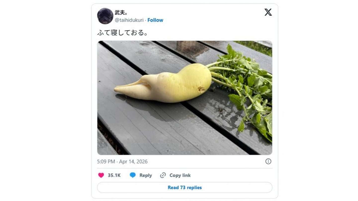 「頼むから機嫌を直してよ」――思わずそう声をかけたくなる姿が、X上で注目されている。 そっぽ向いてる...(画像は武夫。@taihidukuriさんの投稿より) 「ふて寝しておる」 2026年4月14日、Xユーザーの「武夫。」(@taihidukuri)さんがそんな呟きと共に投稿したのは、葉が付いた状態の大根だ。 先端部分は二股に分かれていて、なんだか人間の足っぽい。そして緑色の首との境目が、お尻のようにぷっくり。 まるで、こちらに背を向けて横たわっているかのよう。というか、完全に「ふて寝」の姿勢です! Jタウンネット記者は21日、この大根について「武夫。」さんに話を聞いた。 背中で語ってる 何があったの...?(画像は武夫。@taihidukuriさんの投稿より) 「武夫。」さんは、屋久島在住の農業従事者。 注目を集めた〝ふて寝大根〟は14日の朝、畑で収穫作業を行っている時に採れたものだという。 「こういったやつもたくさん獲れます」(「武夫。」さん) 「武夫。」さんの畑に現れた妙に人間味のある大根に、X上では3万5000件以上のいいね(21日夕時点)のほか、こんな声が寄せられている。 「どうした?畑でなにかイヤな事あった?話し聞こうか? 「この曲がり具合、足の感じ、フサフサの葉。ほんとにふて寝だ」 「大根「はいはい、どうせ俺は出荷されませんよーだ」」 「そのうちおしりをボリボリと掻きそう」 「背中で語るタイプの大根ですね」 なお、その後〝ふて寝大根〟は「武夫。」さんが自家用としておいしくいただいたとのこと。 それなら大根もきっと、機嫌をなおしたことだろう。