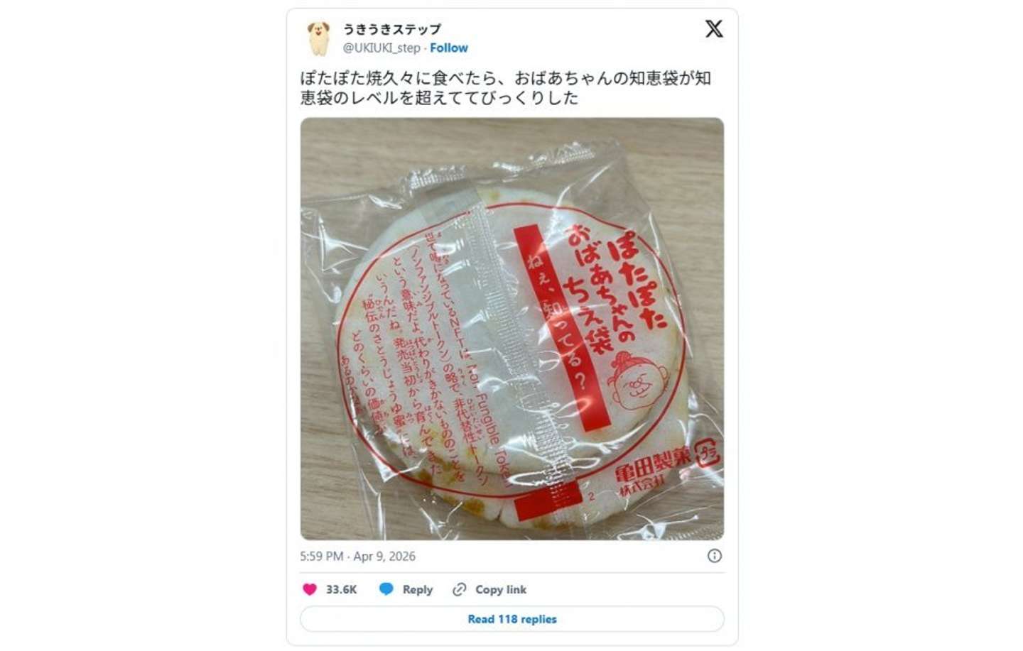「ぽたぽた焼久々に食べたら、おばあちゃんの知恵袋が知恵袋のレベルを超えててびっくりした」 そんな呟きと共に投稿された写真が、X上で注目されている。 「ぽたぽた焼」といえば、亀田製菓(本社:新潟県新潟市)が販売している、甘じょっぱい味が特徴のおせんべい。 個包装の袋には、生活に役立つ豆知識や簡単なクイズが掲載されているのを覚えている皆さんも多いと思うが......知恵袋のレベルを超えてるって、どういうこと? こんなおばあちゃん、知らない......(画像はうきうきステップ@UKIUKI_stepさんの投稿より) 2026年4月9日、Xユーザーのうきうきステップ(@UKIUKI_step)さんが紹介した「ぽたぽたおばあちゃんのちえ袋」の内容は、こうである。 「世で噂になっているNFTは、Non-Fungible Token(ノンファンジブルトークン)の略で、非代替性トークンという意味だよ。代わりがきかないもののことをいうんだね。発売当初から育んできた"秘伝のさとうじょうゆ蜜"には、どのくらいの価値があるのかなぁ。」 えっ、NFTの話しとる......!? 「おばあちゃんのちえ袋」としてこれを聞かされるの、かなり違和感があるんだが!?!?!? ギャップが凄すぎる「ちえ」に、X上では3万3000件以上のいいね(27日夕時点)のほか、こんな声が寄せられている。 「おばあちゃん横文字も強い」 「『ねぇ、知ってる?』のレベルじゃない」 「これが本当のコンピューターおばあちゃん か」 「こち亀にでてくるレベルの最先端おばあちゃん」 「お前のようなババァがいるか!」 「バックグラウンドでめちゃめちゃ勉強してる姿が目に浮かぶ」 「おばあちゃん、本当は何の仕事してるの...。お煎餅焼いてるのは仮の姿でしょ...」 おばあちゃんは何故こんなことを知ってるの? 亀田製菓に聞く ITおばあちゃんのちえ袋(画像は再掲) 取材に応じた投稿者・うきうきステップさんによると、おばあちゃんがNFTのことを教えてくれたのは、9日の仕事中。お菓子を食べようと「ぽたぽた焼」を手に取り、ふと「ちえ袋」の存在を思い出して裏面を見た。 「おばあちゃんの知恵袋見たさに裏面を見たのに、カタカナが羅列されていてとても驚きました。他のパッケージにはパスタのソースがお皿にこびりついた時の落とし方などが書かれていたので、このパッケージだけ人が変わったのかと思いました」(うきうきステップさん) 他の袋では相変わらず「おばあちゃんのちえ袋」らしい知識も伝授してくれているという、おばあちゃん。なぜ、こんなに知識の幅が広いのか? 記者は22日、亀田製菓に「ちえ袋」の内容の選定基準について取材した。 生活の知恵バージョン(画像提供:亀田製菓) 取材に応じた同社マーケティング戦略部の「ぽたぽた焼」担当者によると、「おばあちゃんのちえ袋」の内容は不定期に更新されている。 その時々によって、名前も「みんなのちえ袋」だったり「ぽたぽた親子あそび」だったりと、時代に合わせて変化しているという。 「みんなのちえ袋」(画像提供:亀田製菓) 23年8月には、商品とおばあちゃんのデザインがリニューアルされたことに伴って、約10年ぶりに「ぽたぽたおばあちゃんのちえ袋」が復活した。 亀田製菓 ぽたぽた焼 Amazonで見る 楽天で見る 最新のおばあちゃん知識を記載 昔の「おばあちゃんのちえ袋」(画像提供:亀田製菓) 新しい「おばあちゃんのちえ袋」(画像提供:亀田製菓) 「『ぽたぽた焼』が家族のコミュニケーションのきっかけになって欲しいという想いから、家族みんなで考えられるなぞなぞや、思わず『へぇ~、そうなんだ!』と驚いていただけるような最新のおばあちゃん知識を記載しています」(担当者) 近年ではSNSやAIの普及により、世代を問わず様々な知識に触れられる時代になっている、と担当者。 その中で「ぽたぽた焼」のおばあちゃんは、昔ながらの生活の知恵だけでなく、時代の変化も柔軟に受け止めながら多くの人に知恵を分けて優しく寄り添ってくれる"みんなのおばあちゃん"として描いているという。 「そのため扱うテーマも自然と幅広くなり、そうした意外性が、結果として多くの方に興味を持っていただくきっかけになっているのではないかと考えています」(担当者) 幅広い知識を皆に(画像提供:亀田製菓) 時代の流れと共にアップデートされている「おばあちゃんのちえ袋」。この度「NFT」のちえが注目を浴びたことについて、担当者は 「『おばあちゃんのちえ袋』の中のひとつの内容が、SNSを通じて多くの方に注目していただいていることをとてもありがたく感じています。『ぽたぽた焼』はこれからも、ご家族やさまざまな世代の方々の会話のきっかけになるような知恵や話題を大切にお届けしていきたいです」 とコメントしている。 「そういえば最近、ぽたぽた焼食べていないな~」という皆さんも、「食べてたけど、パッケージのチェックはサボってた!」という皆さんも、改めておばあちゃんに「ちえ」を授けてもらうのは、いかが? 亀田製菓 ぽたぽた焼 Amazonで見る 楽天で見る